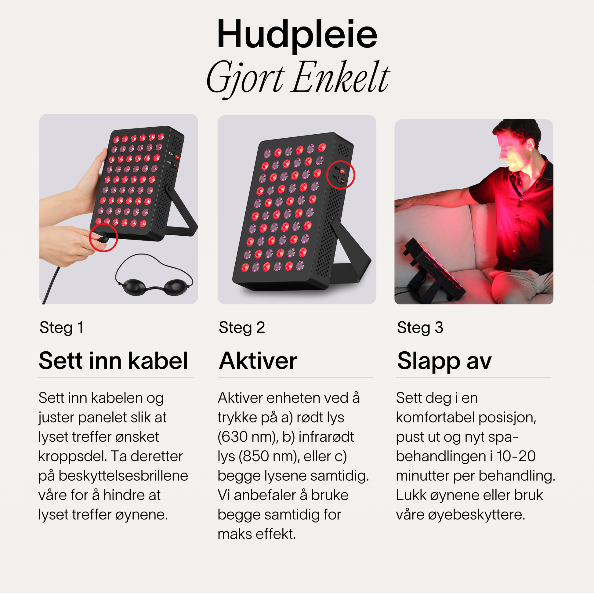 Vi anbefaler en avstand på15 til 50 cm i 10 til 20 minutterpå det aktuelle området. Lengre økter mister effekt, ettersom cellene slutter å absorbere lys etter 20 minutter. Jo lengre unna du er, desto lengre bør økten være, sidenlysintensiteten reduseres med avstanden. Eksakte tall kan variere; lytt til kroppen din for å finne de optimale innstillingene.